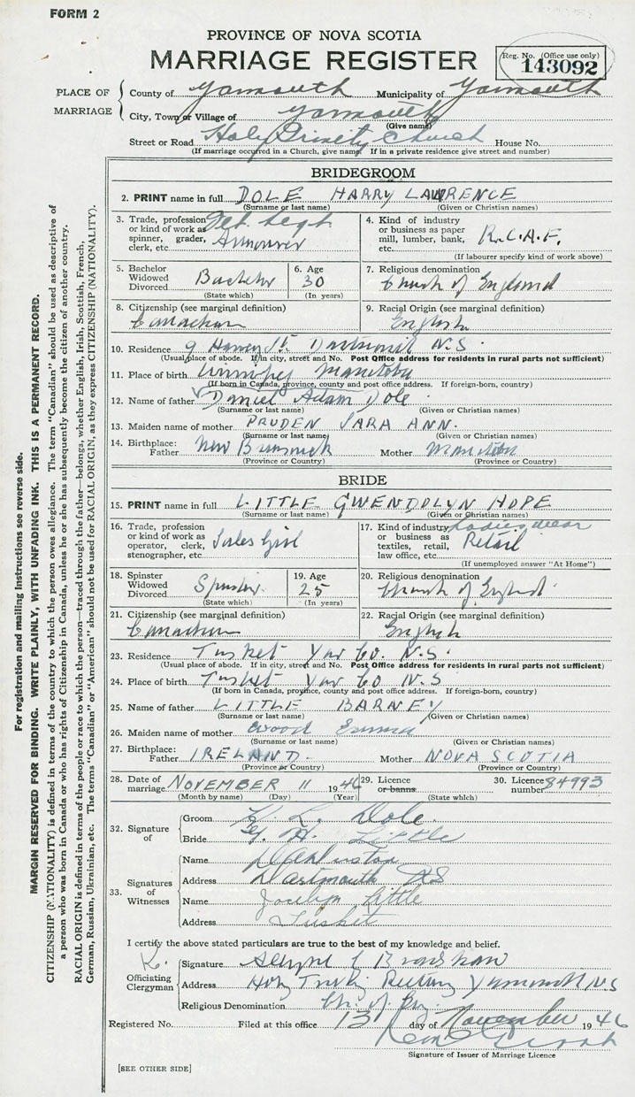 28. Date of marriage November 11 1946 29. By license or banns License 30. License number 84993