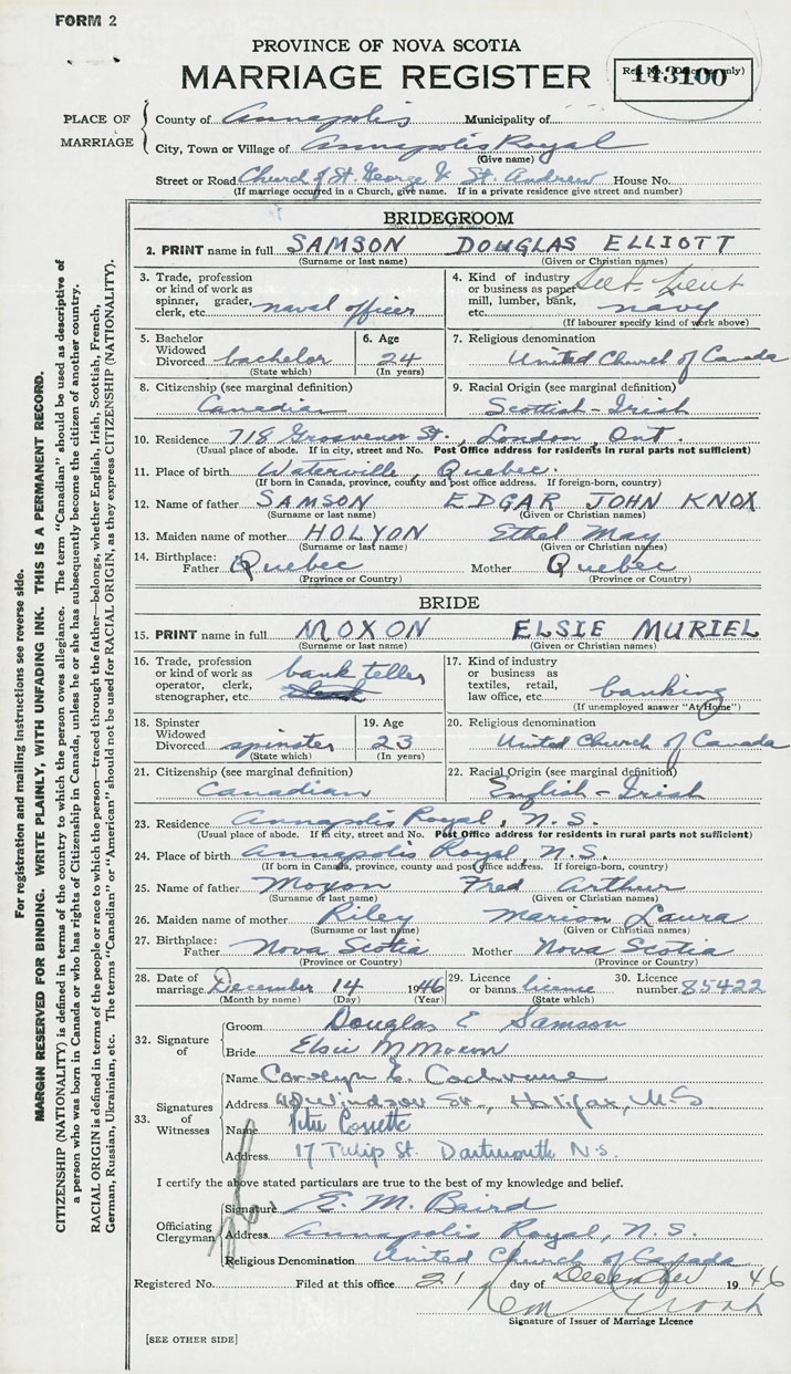 28. Date of marriage December 14 1946 29. By license or banns License 30. License number 85422