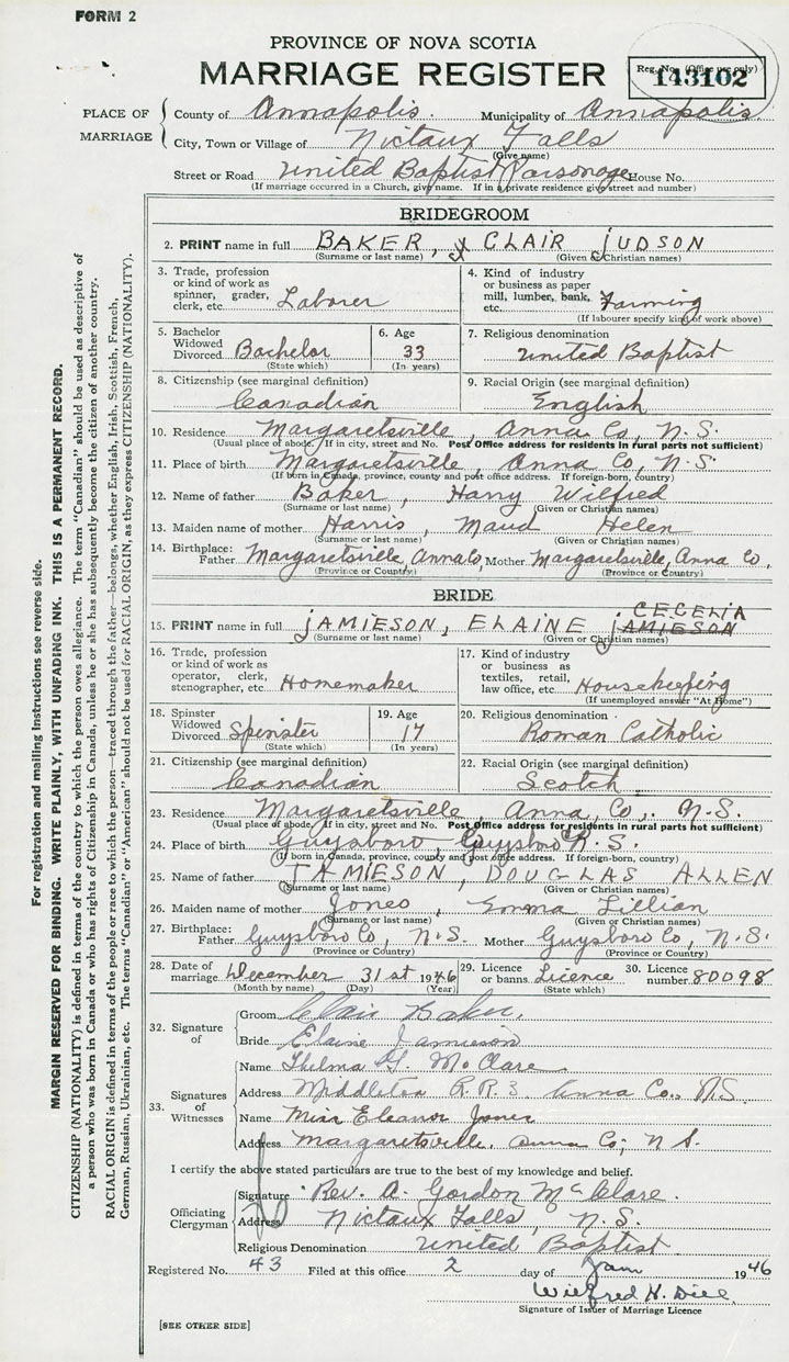 28. Date of marriage December 31 1946 29. By license or banns License 30. License number 80098