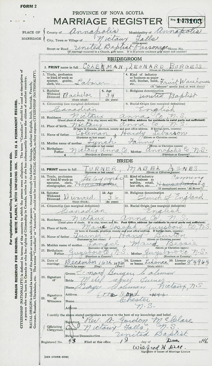 28. Date of marriage December 16 1946 29. By license or banns License 30. License number 84964
