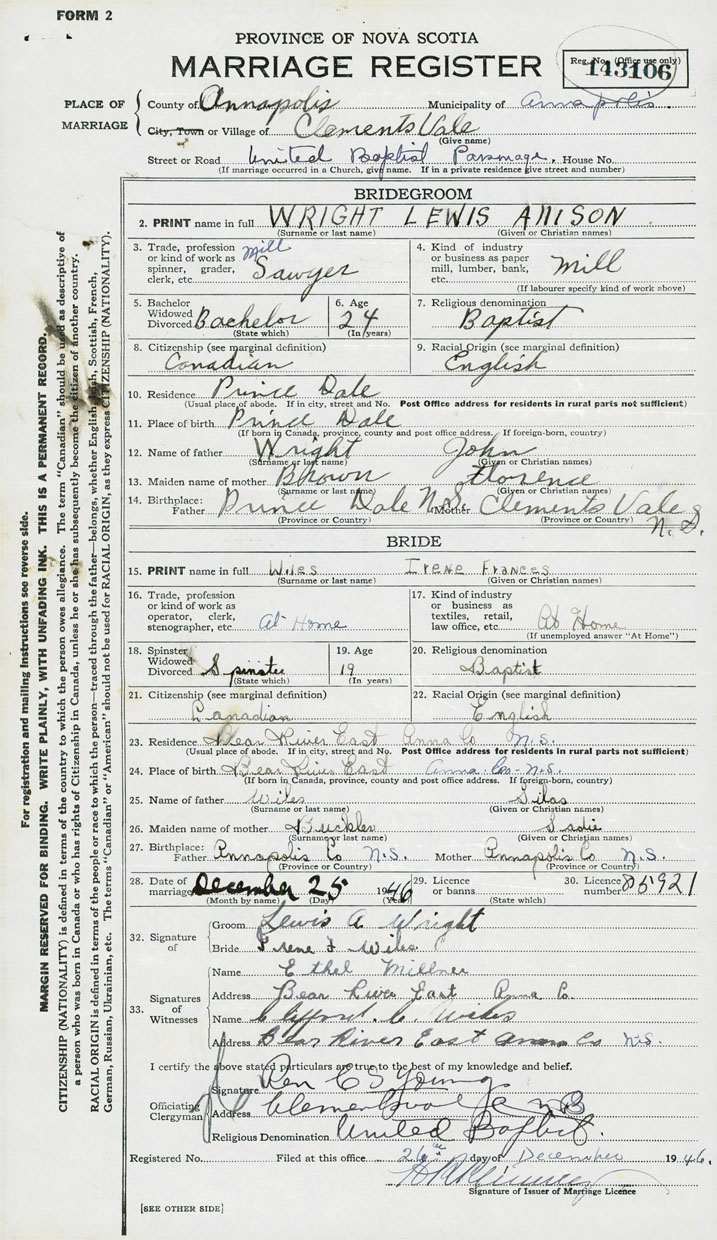 27. Birthplace Father Annapolis County Mother Annapolis County