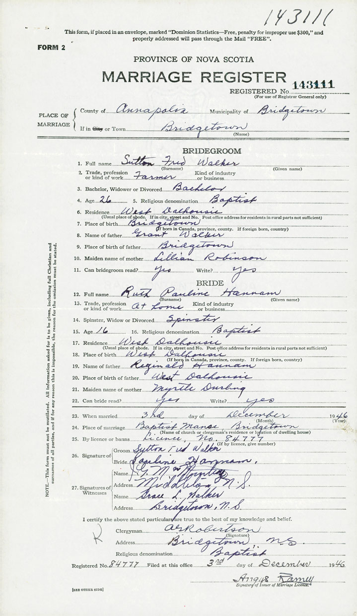 26. Place of marriage Baptist Manse Bridgetown, Annapolis County