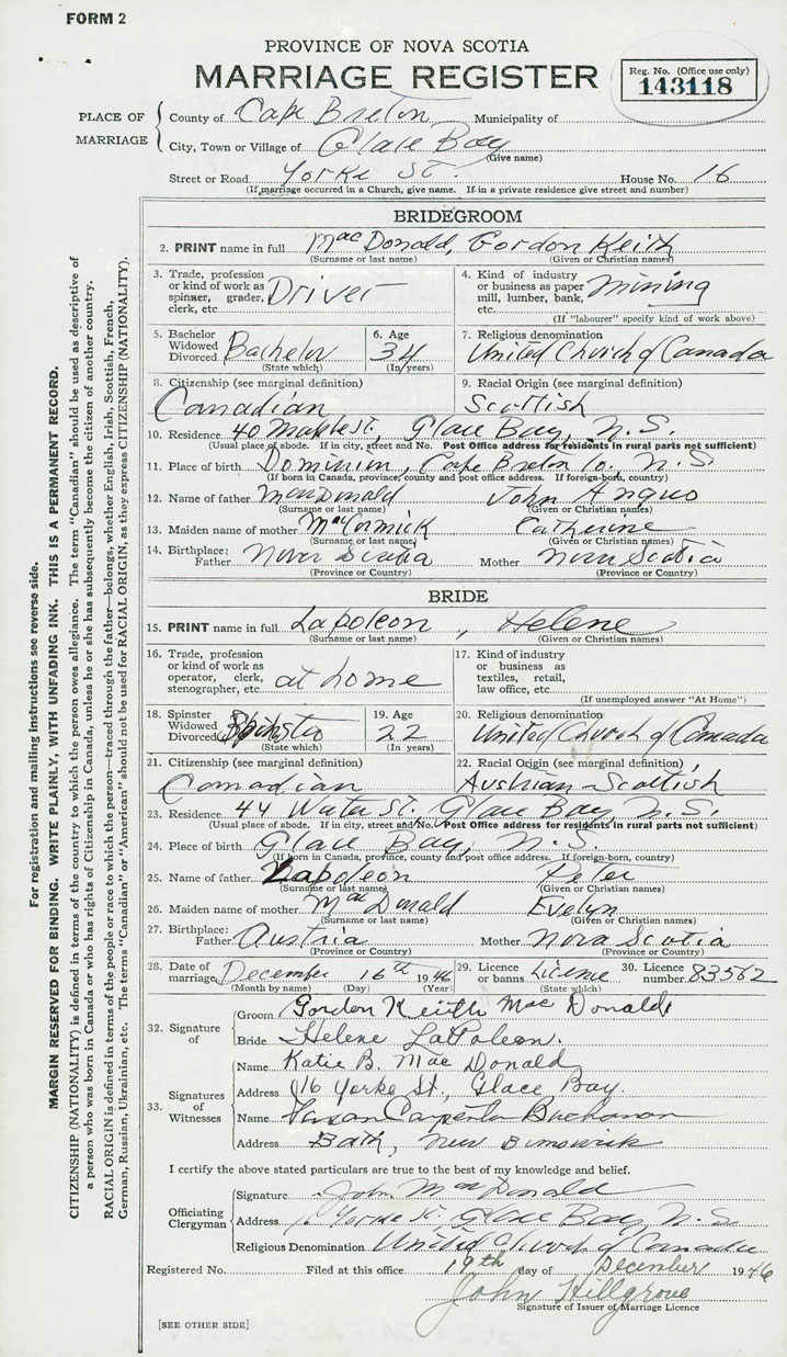 28. Date of marriage December 16 1946 29. By license or banns License 30. License number 83562