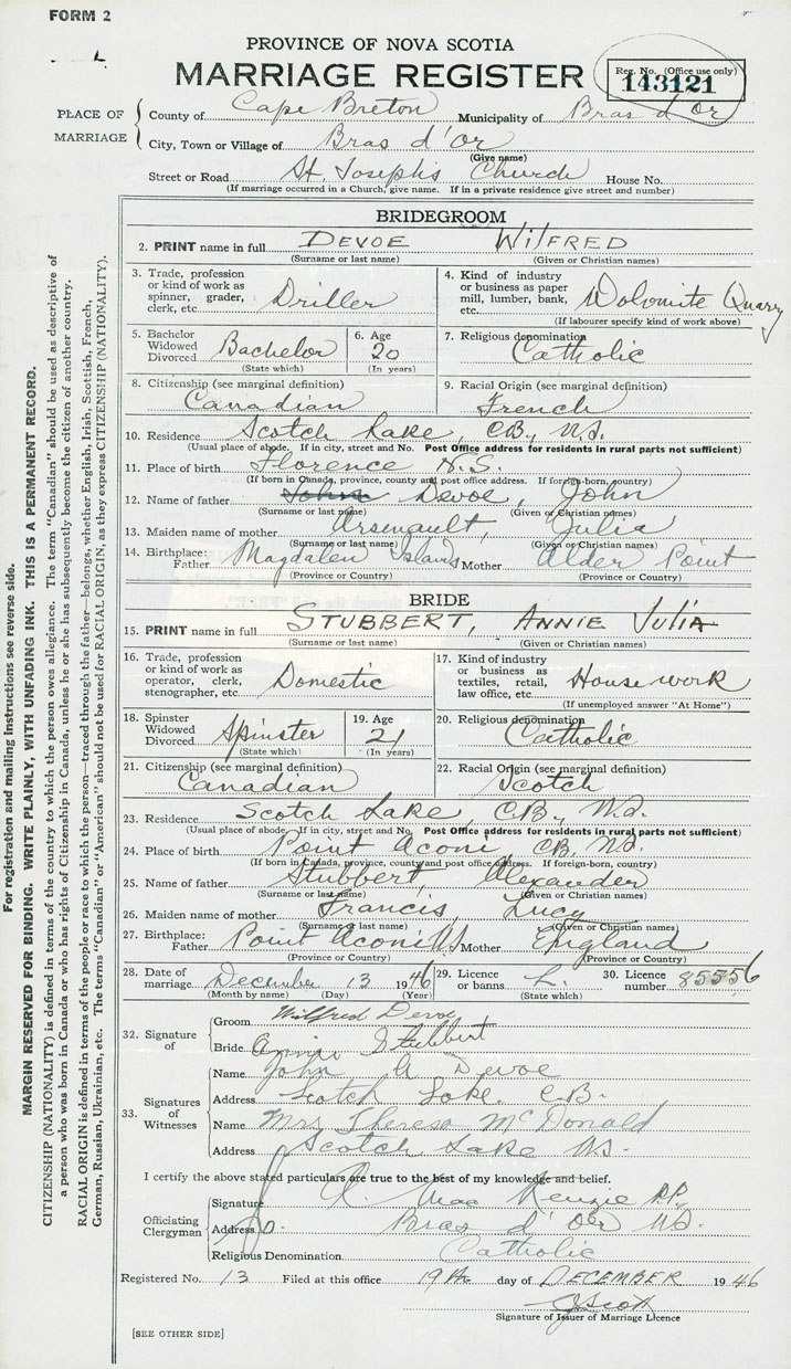 28. Date of marriage December 13 1946 29. By license or banns License 30. License number 85556