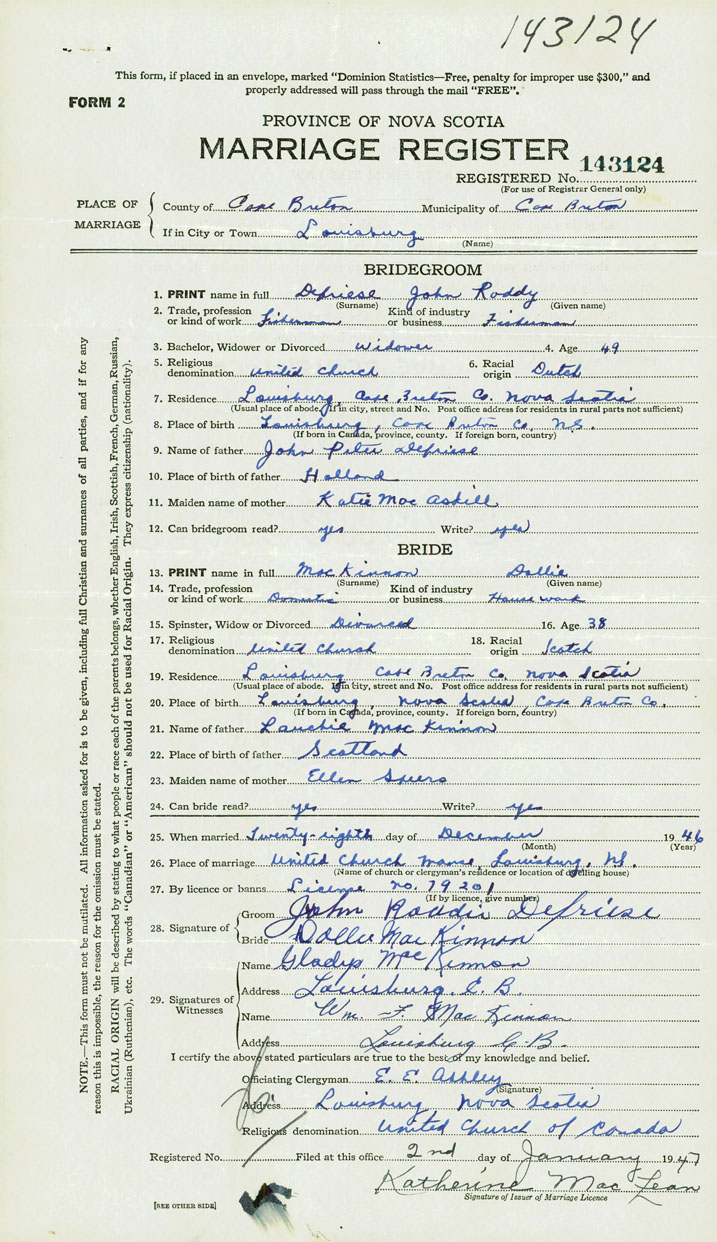 26. Place of marriage United Church Manse Louisburg, Cape Breton County