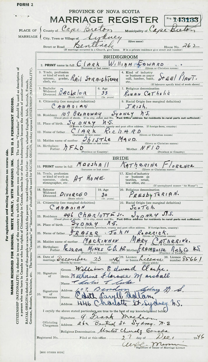 28. Date of marriage December 23 1946 29. By license or banns License 30. License number 85661