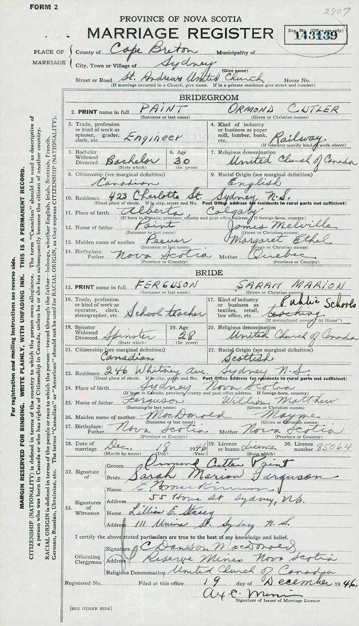 28. Date of marriage December 18 1946 29. By license or banns License 30. License number 85064