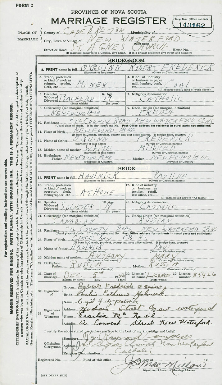 14. Birthplace Father Newfoundland Mother Newfoundland