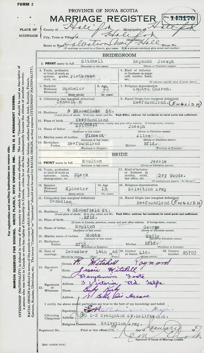 28. Date of marriage December 14 1946 29. By license or banns License 30. License number 85703