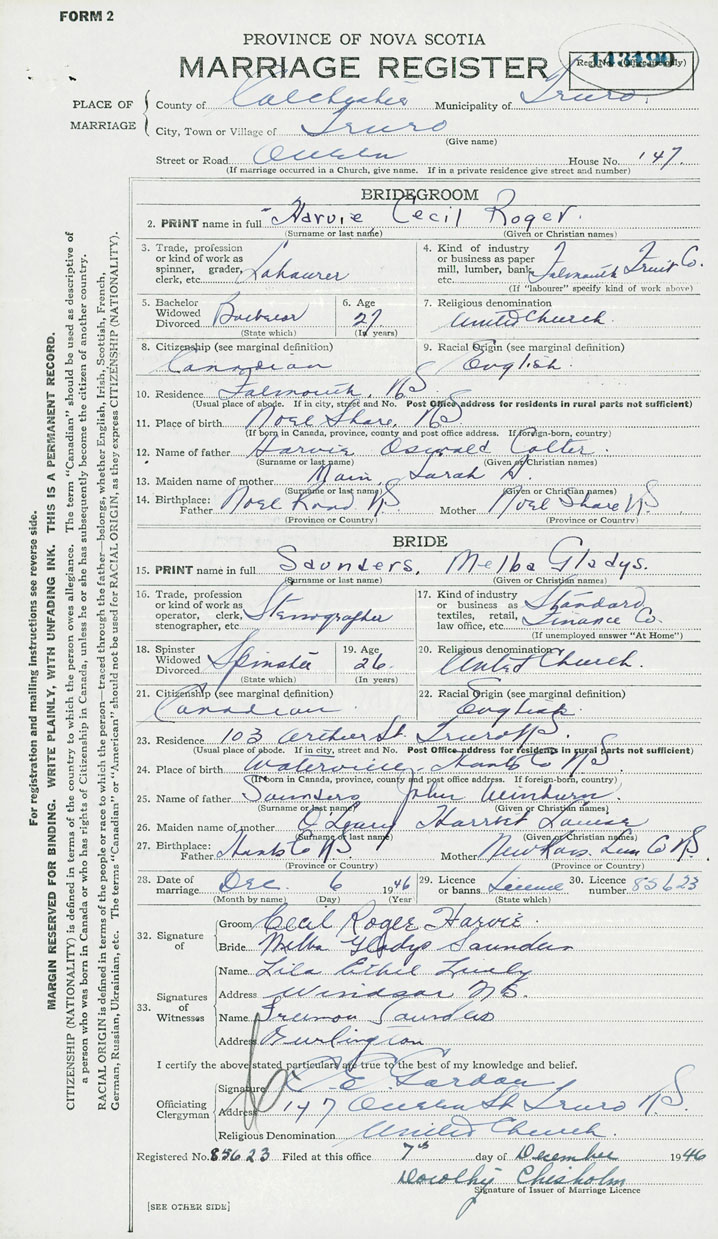 28. Date of marriage December 6 1946 29. By license or banns License 30. License number 85623