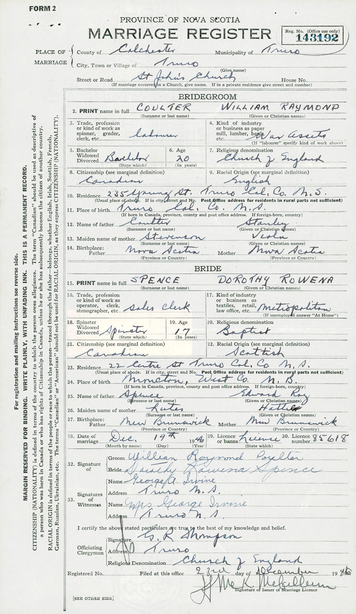 28. Date of marriage December 19 1946 29. By license or banns License 30. License number 85618