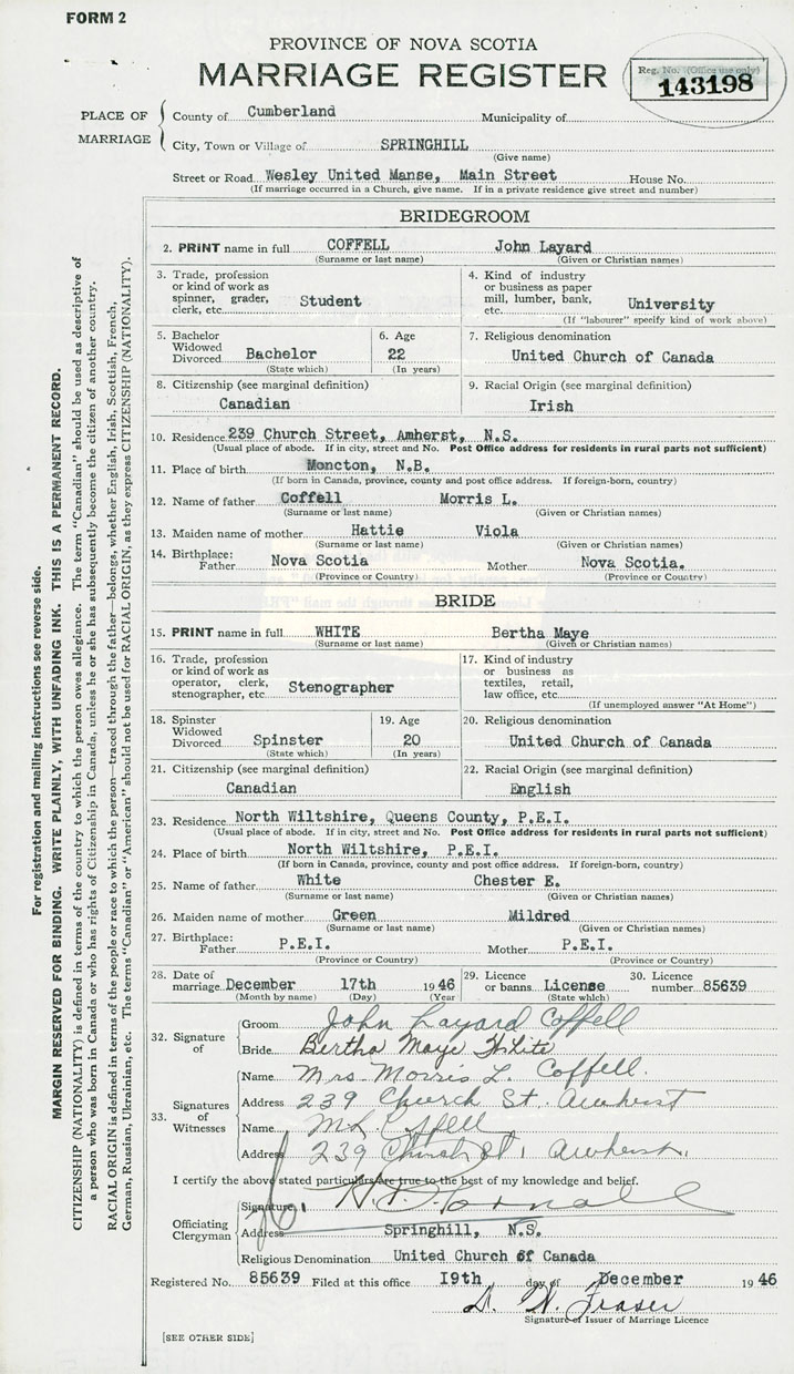 28. Date of marriage December 17 1946 29. By license or banns License 30. License number 85639