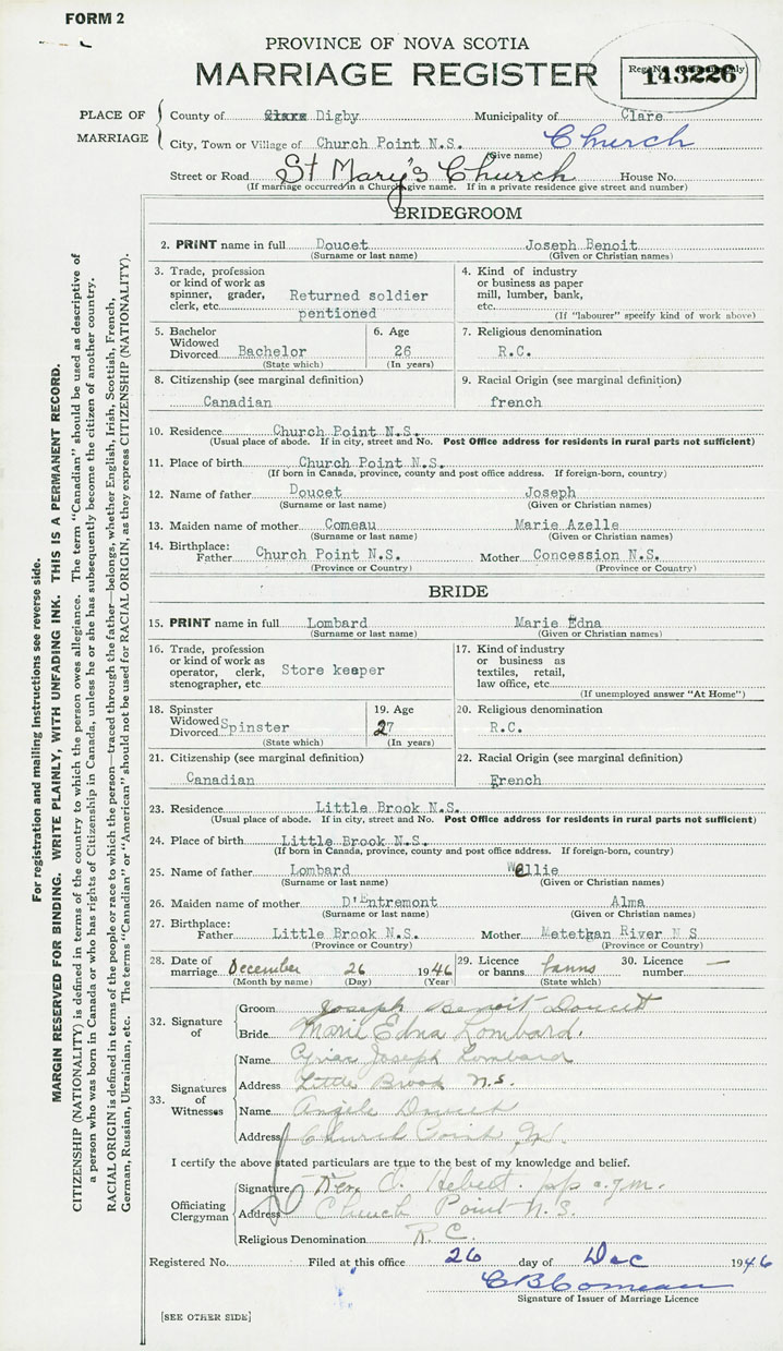 28. Date of marriage December 26 1946 29. By license or banns Banns 30. License number Banns