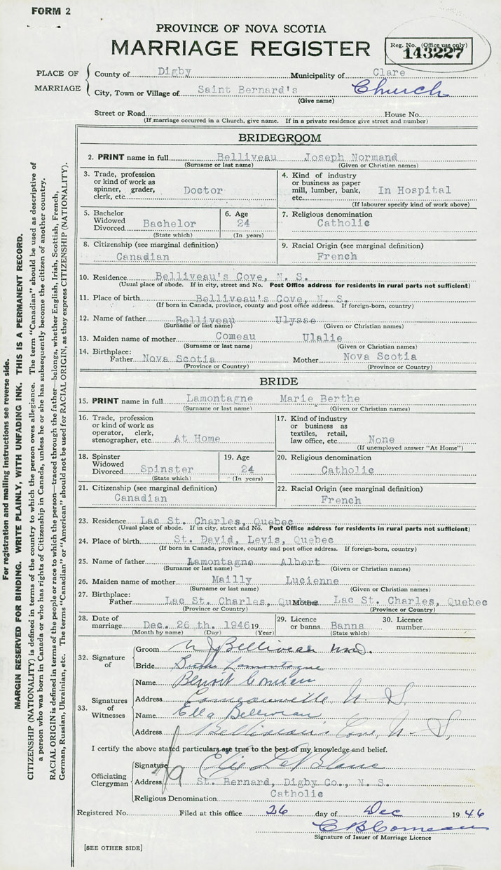 28. Date of marriage December 26 1946 29. By license or banns Banns 30. License number Banns