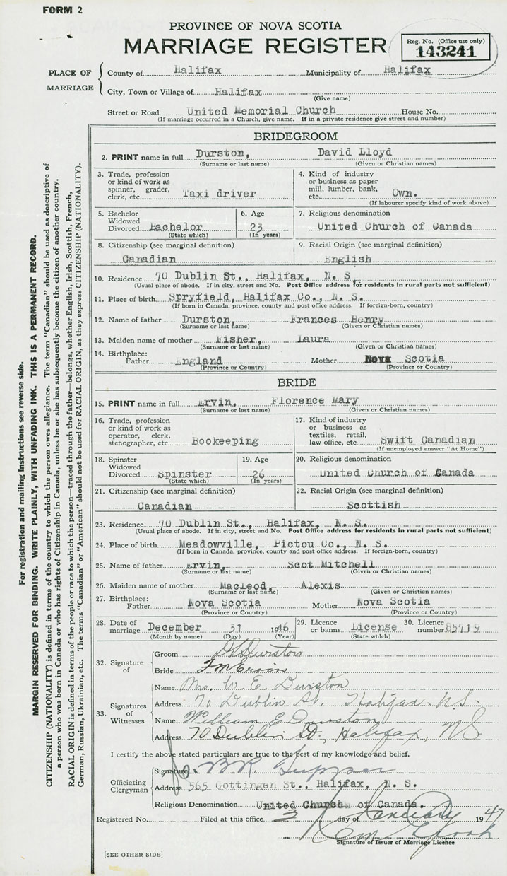 28. Date of marriage December 31 1946 29. By license or banns License 30. License number