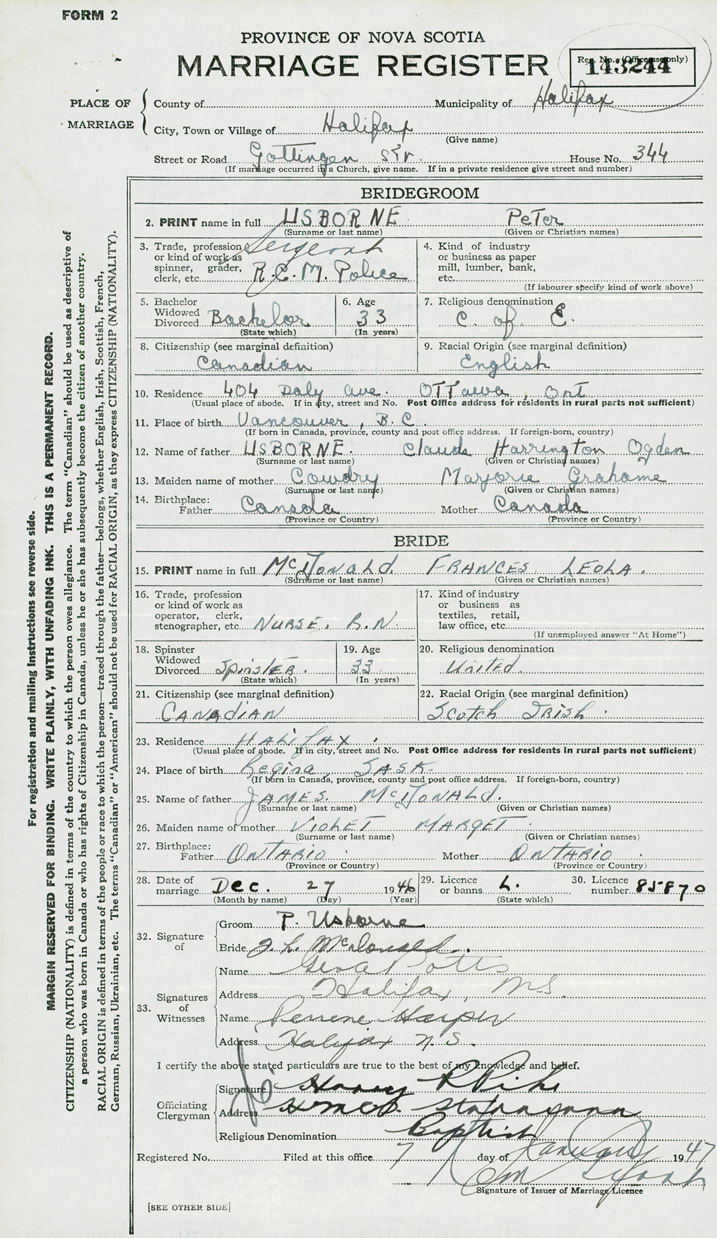 28. Date of marriage December 27 1946 29. By license or banns License 30. License number 85870