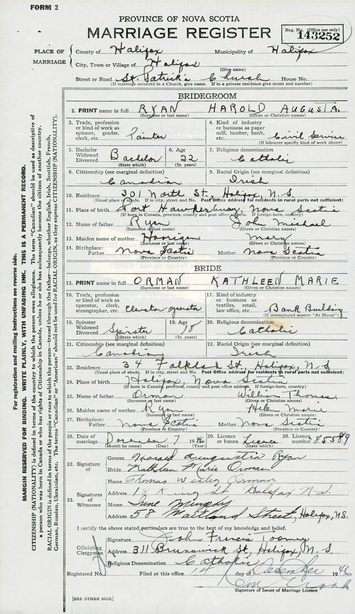 Groom Harold Augusta Ryan