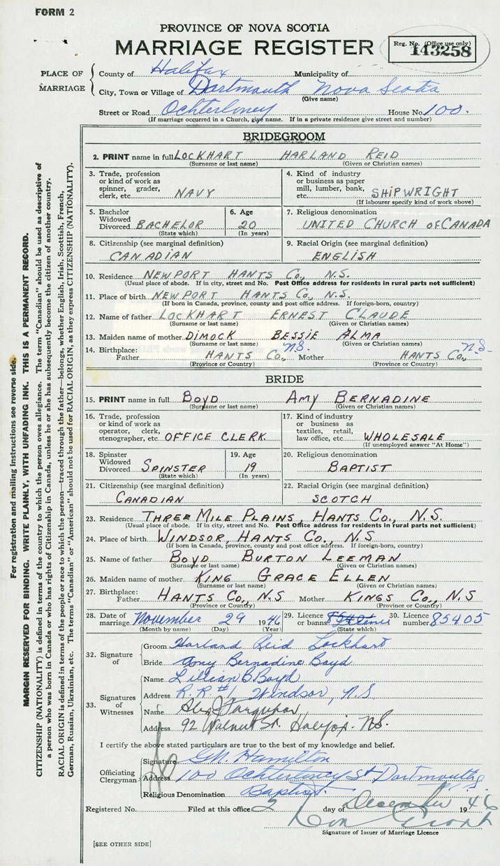 28. Date of marriage December 29 1946 29. By license or banns License 30. License number 85405
