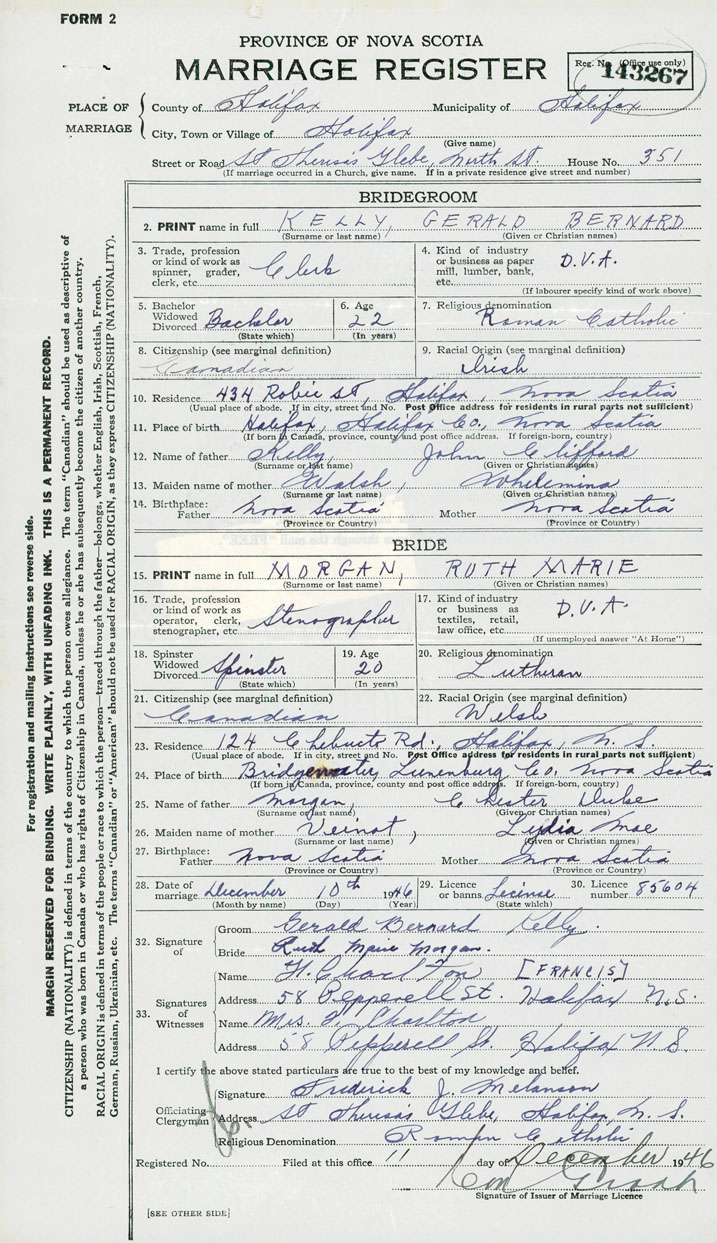 28. Date of marriage December 10 1946 29. By license or banns License 30. License number 85604