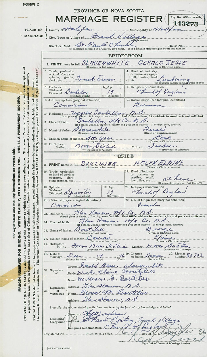 28. Date of marriage December 14 1946 29. By license or banns License 30. License number 85702