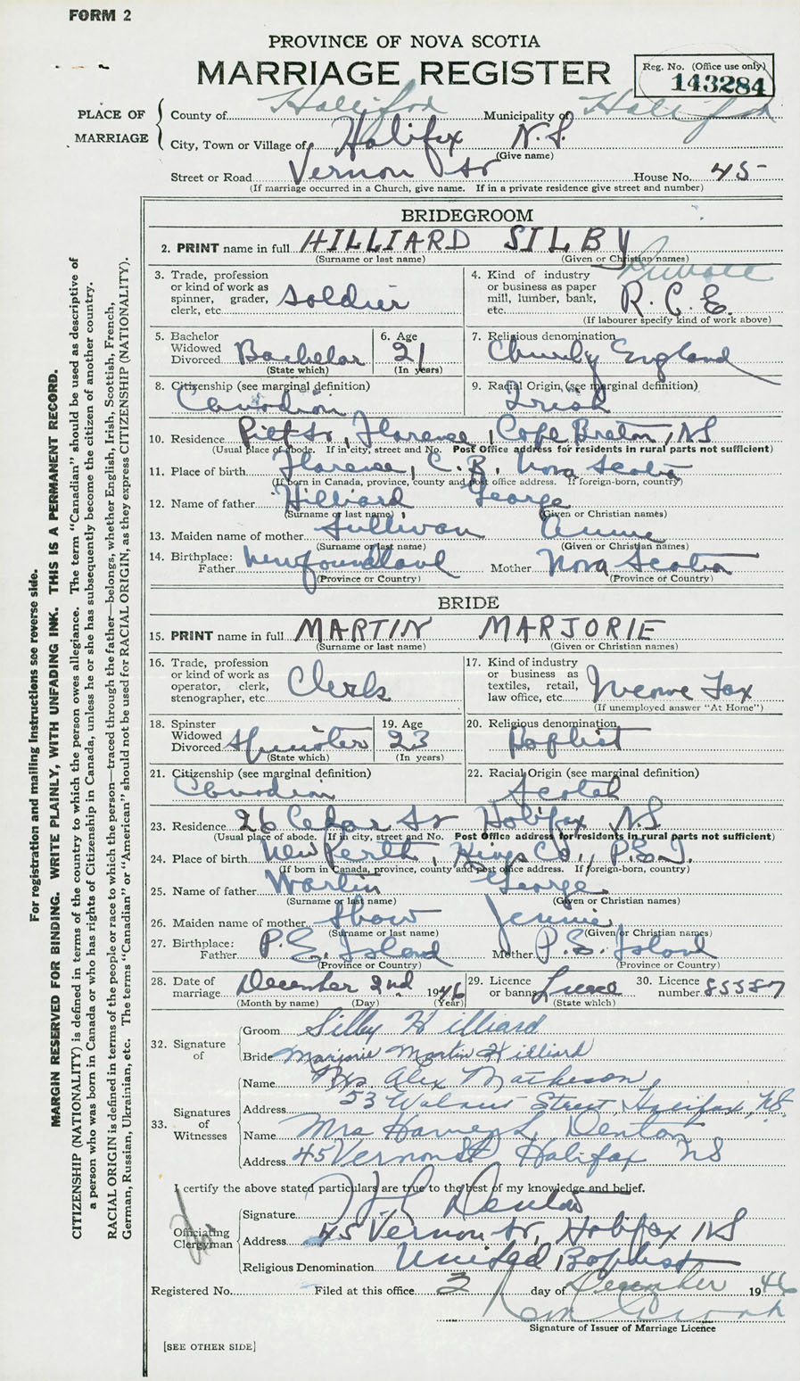 28. Date of marriage December 4 1946 29. By license or banns License 30. License number 85587