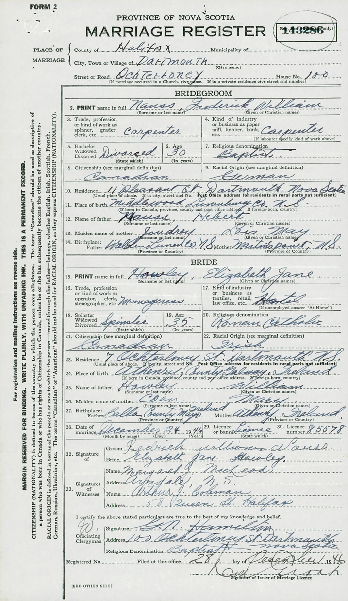 28. Date of marriage December 24 1946 29. By license or banns License 30. License number 85578