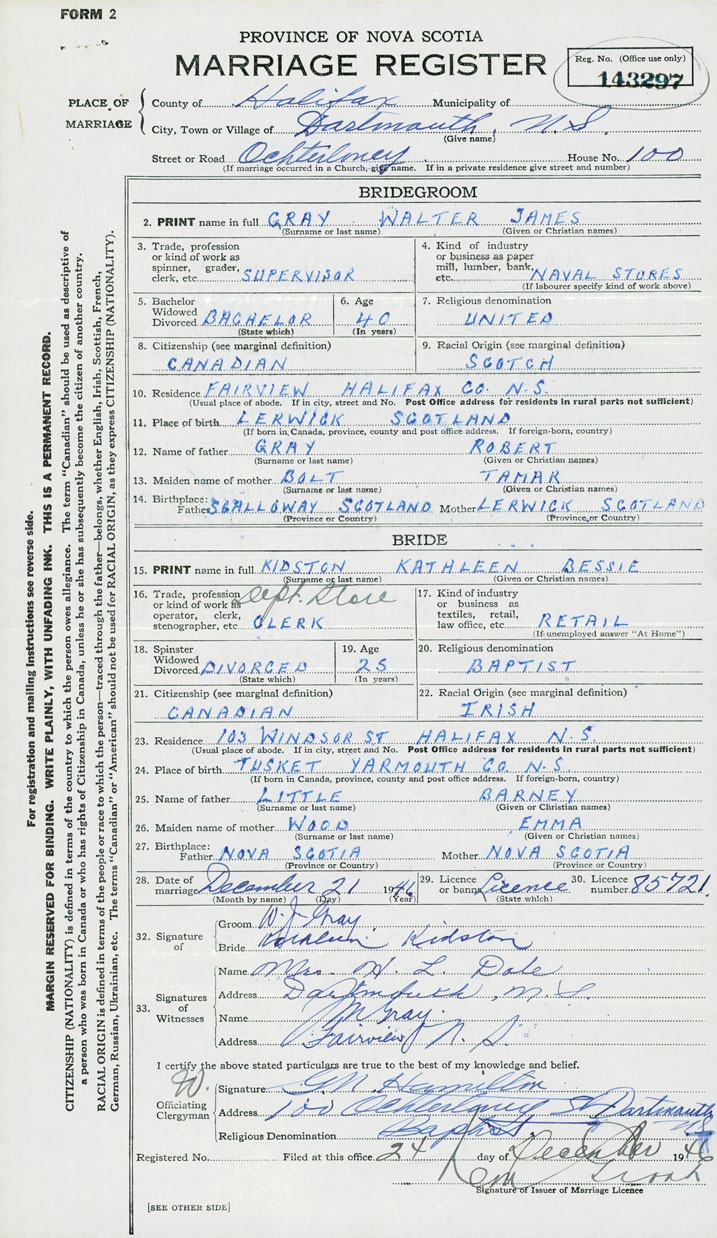 28. Date of marriage December 21 1946 29. By license or banns License 30. License number 85721