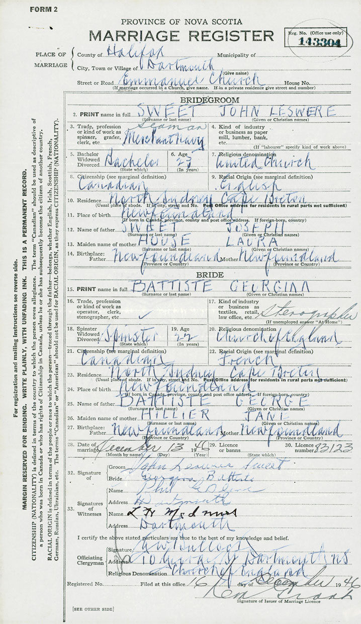 28. Date of marriage December 13 1946 29. By license or banns License 30. License number 83123
