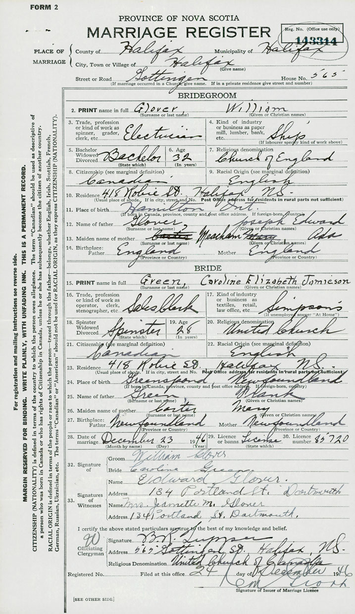 28. Date of marriage December 23 1946 29. By license or banns License 30. License number 85720
