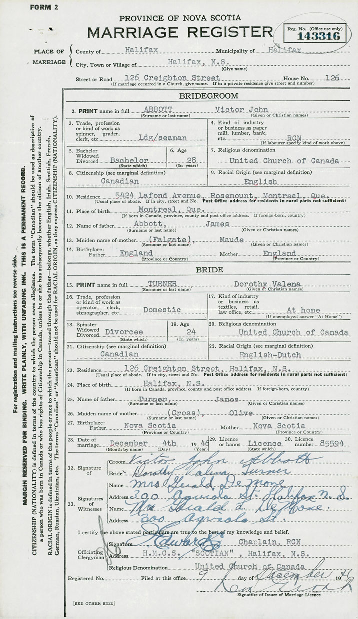 28. Date of marriage December 4 1946 29. By license or banns License 30. License number 85594