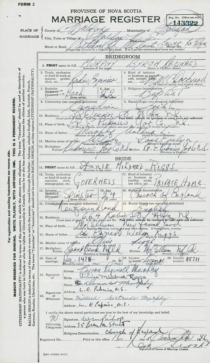 28. Date of marriage December 14 1946 29. By license or banns License 30. License number 85711