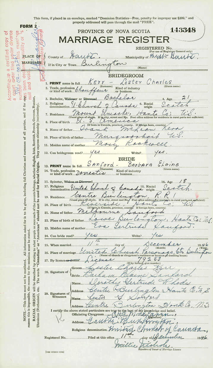 According to a certified copy of the Decree Absolute for Divorce dated 1974-- and filed in the Office of the Registrar General under Divorce number 74-02-002261, it is ordered that the marriage of Lester Charles Kerr and Barbara Elaine Sanford (Registered under marriage number 1946-143348) be null and void.