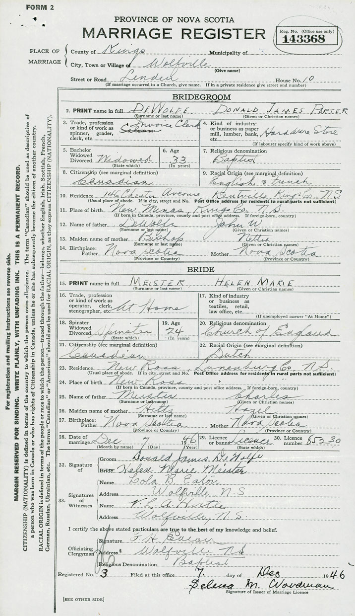 28. Date of marriage December 7 1946 29. By license or banns License 30. License number 85230