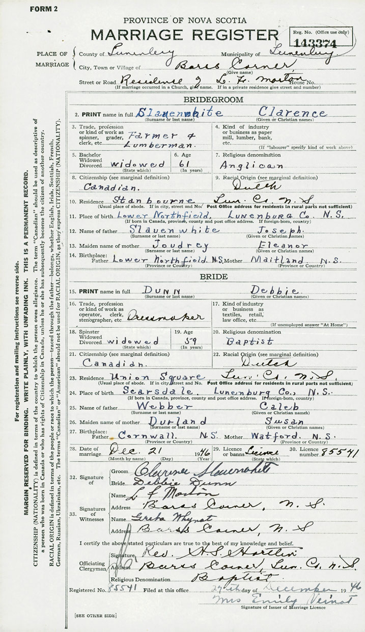 PLACE OF MARRIAGE County of Lunenburg
