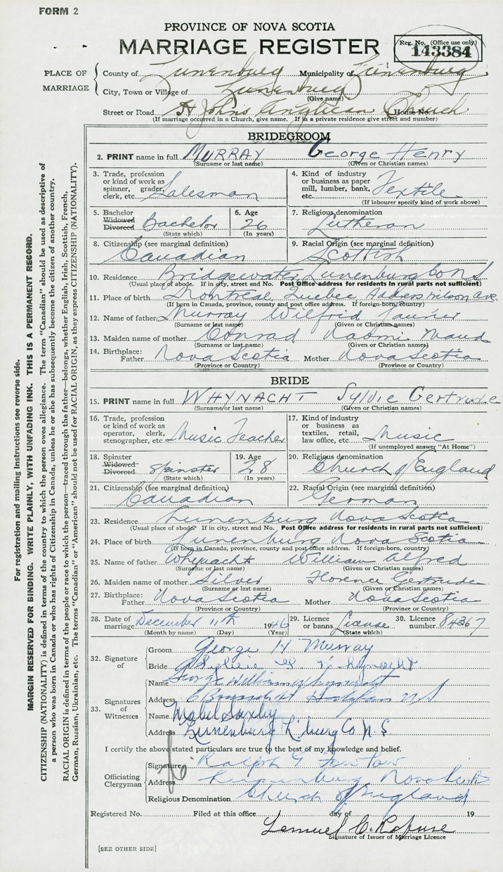 28. Date of marriage December 11 1946 29. By license or banns License 30. License number 84367