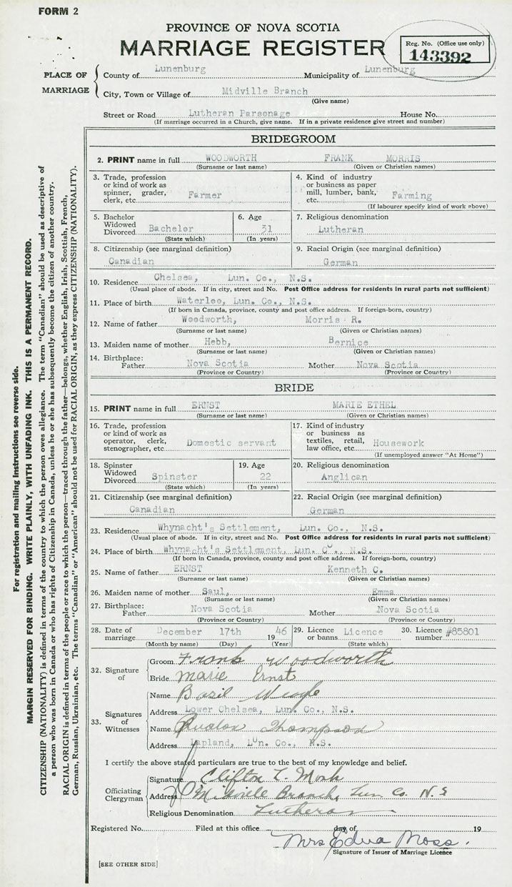 PLACE OF MARRIAGE County of Lunenburg