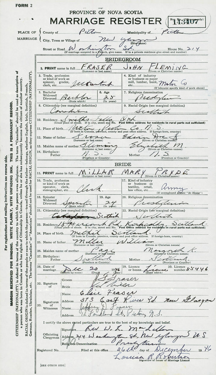 28. Date of marriage December 20 1946 29. By license or banns License 30. License number 85446