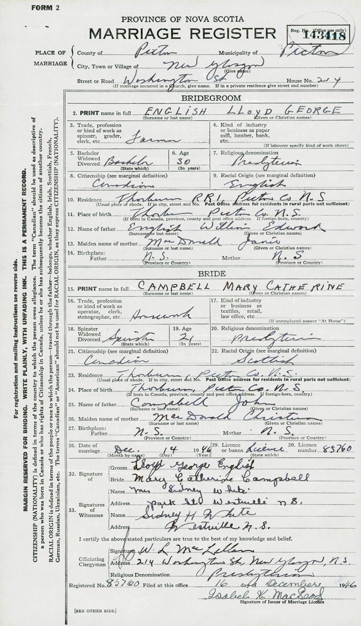 28. Date of marriage December 14 1946 29. By license or banns License 30. License number 85760