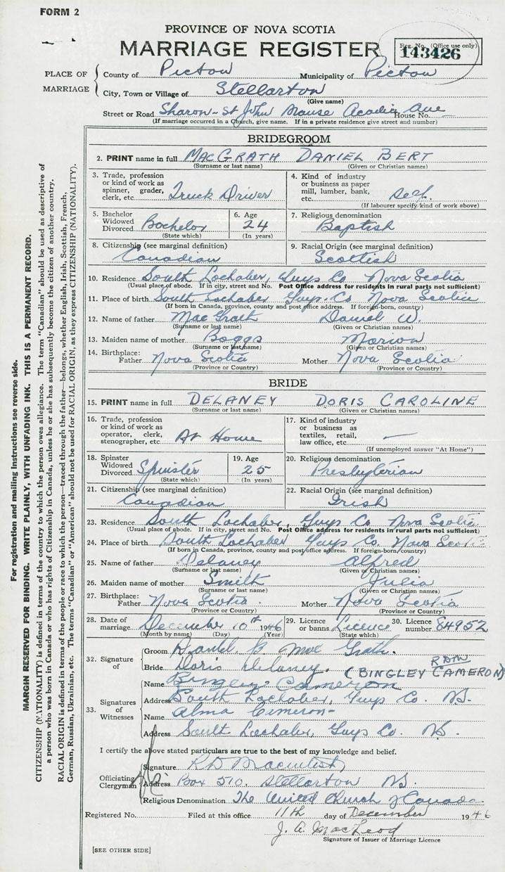 28. Date of marriage December 10 1946 29. By license or banns License 30. License number 84952