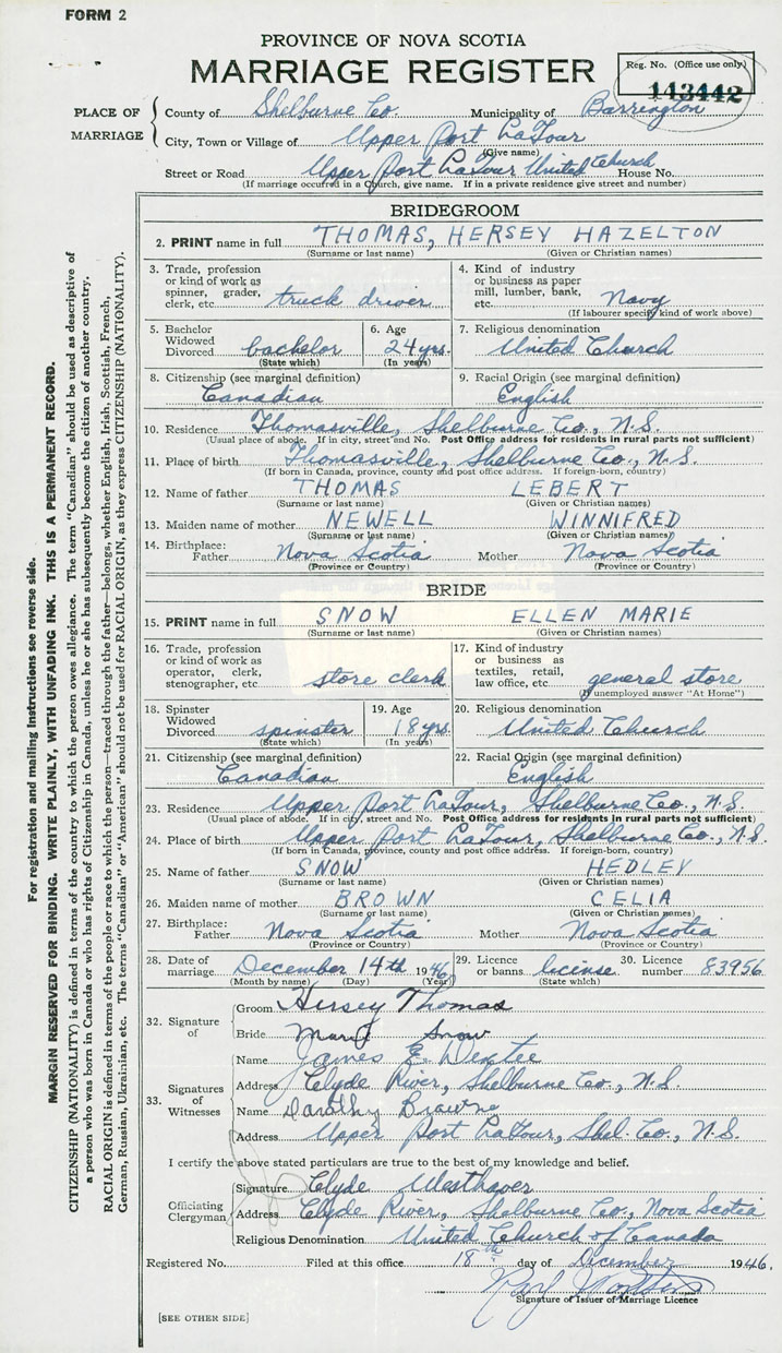 28. Date of marriage December 14 1946 29. By license or banns License 30. License number 83956