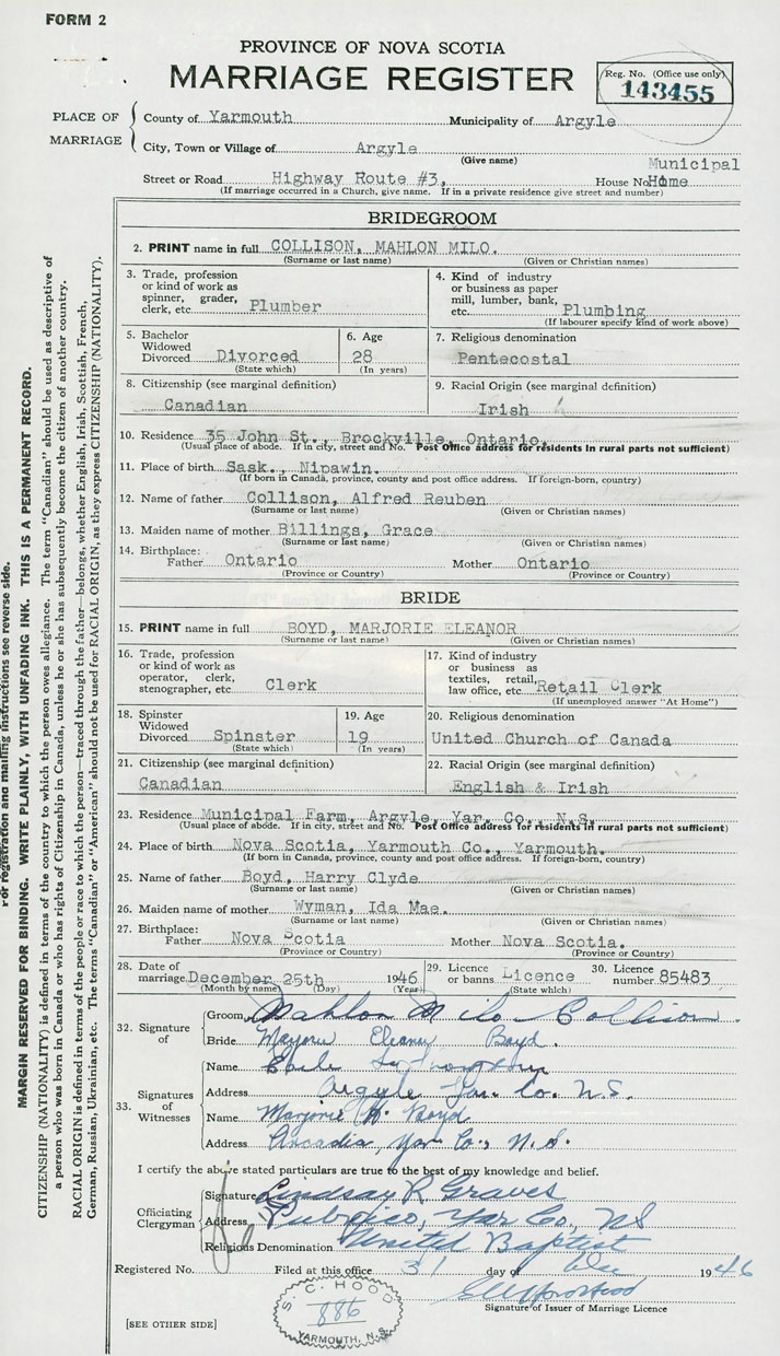 28. Date of marriage December 25 1946 29. By license or banns License 30. License number 85483