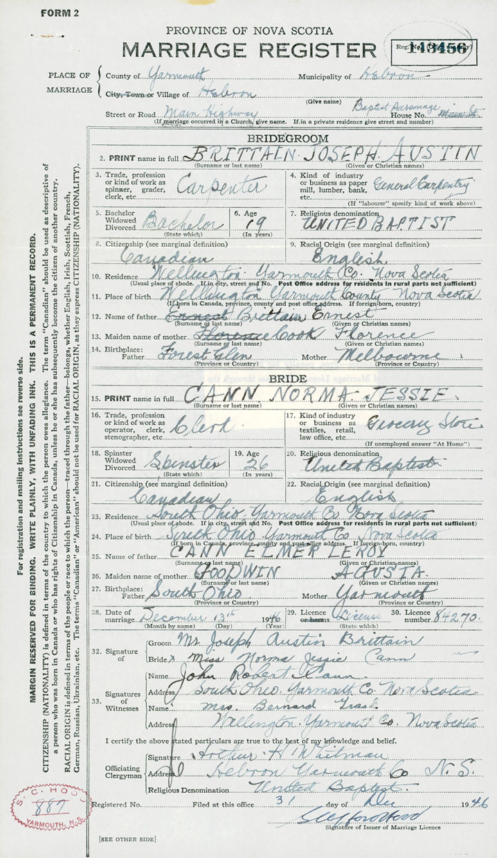 28. Date of marriage December 13 1946 29. By license or banns License 30. License number 84270