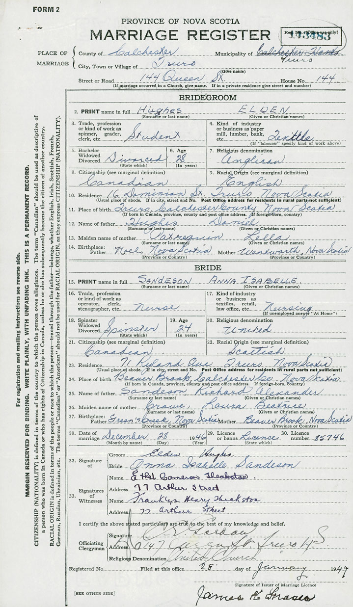 28. Date of marriage December 28 1946 29. By license or banns License 30. License number 85746