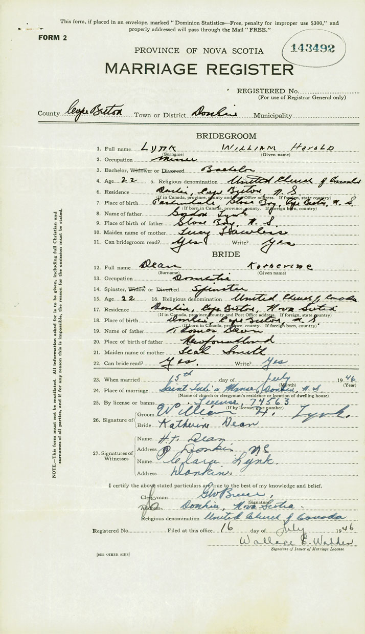 PLACE OF MARRIAGE County of Cape Breton in City or Town Donkin