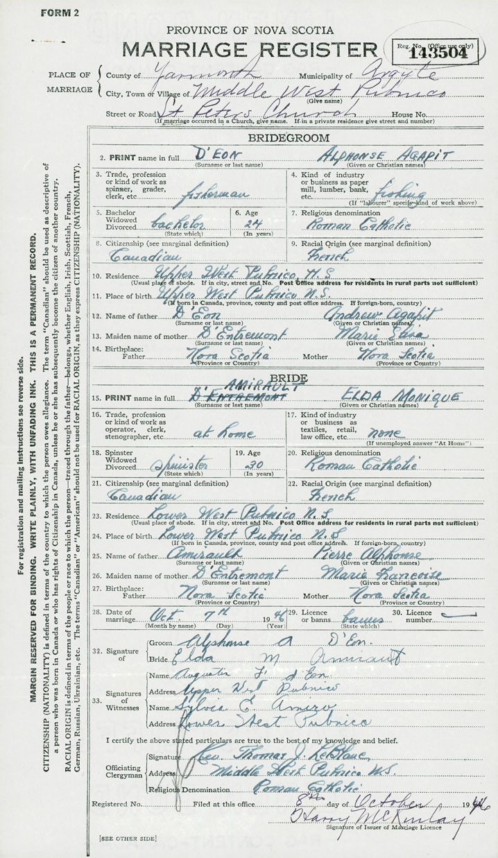 11. Place of birth Upper West Pubnico ,Nova Scotia