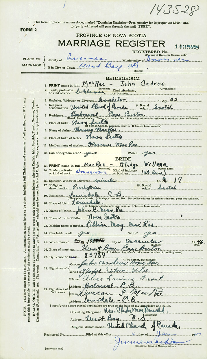 PLACE OF MARRIAGE County of Inverness in City or Town West Bay