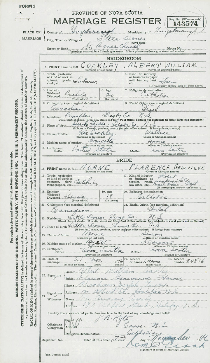 28. Date of marriage November 21 1946 29. By license or banns License 30. License number 84816