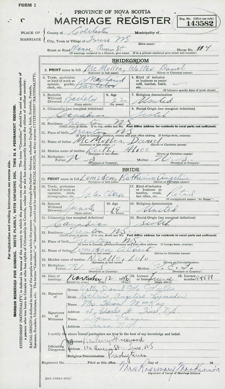 28. Date of marriage November 12 1946 29. By license or banns License 30. License number 84581