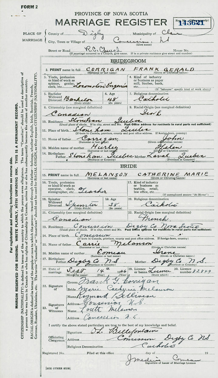 28. Date of marriage September 14 1946 29. By license or banns License 30. License number 82849