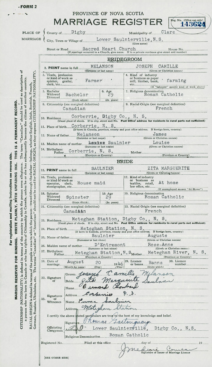27. Birthplace Father Meteghan Station Mother Meteghan River